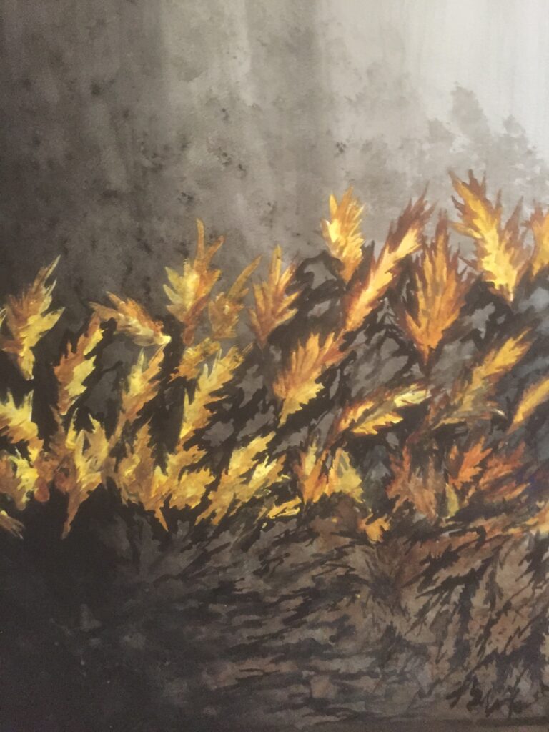 I have been painting wheat or symbols of wheat. Eastern Montana is full of wheat fields. The title of this painting is called Coming Out Of DarknessĀ